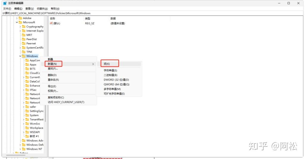 HKEY_LOCAL_MACHINE\SOFTWARE\Policies\Microsoft\Windows2.右键点击Windows文件夹,选择“新建”>“项”,并将新建项命名为“WindowsUpdate”。