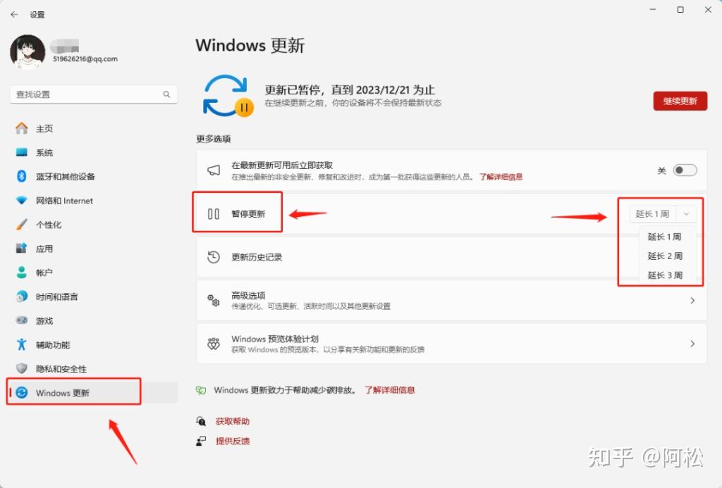 2.选择“更新和安全”>“Windows更新”,在右侧详细信息页面找到暂停更新并选择“延长1周”。这样你可以在接下来的1周都暂时停止Windows的更新。这里可供选择的只有几个选项,只能延迟更新时间,过期后需要重新再来设置。