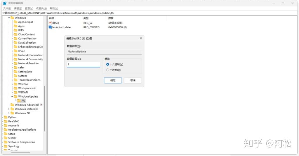 5.双击新建的NoAutoUpdate,在弹出窗口中将数值数据从0更改为1,然后点击“确定”。